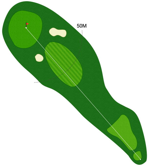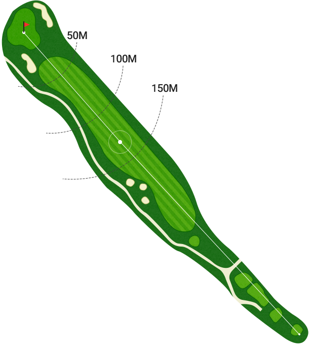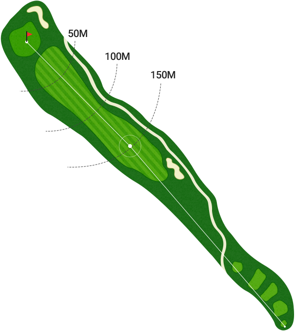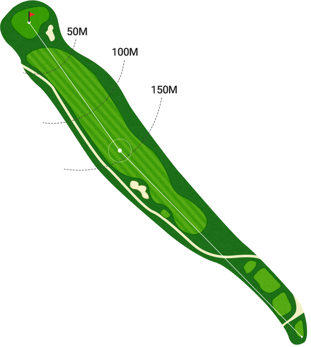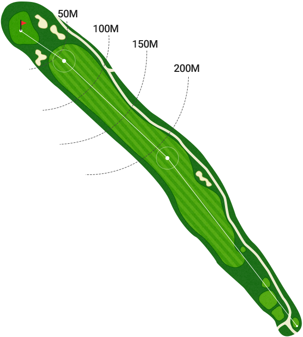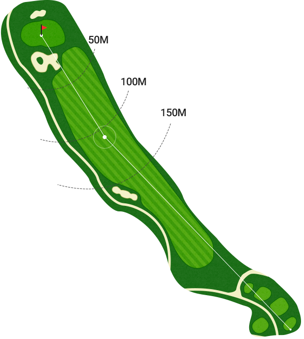전체적으로 약간 오르막으로 배치 된 PAR5 홀입니다. 티샷 시 페어웨이 중앙 좌측을 공략하는 것이 바람직하며 그린 주변의 까다롭게 배치된 벙커를 의식하여 어프로치샷의 정확성이 매우 중요하다.