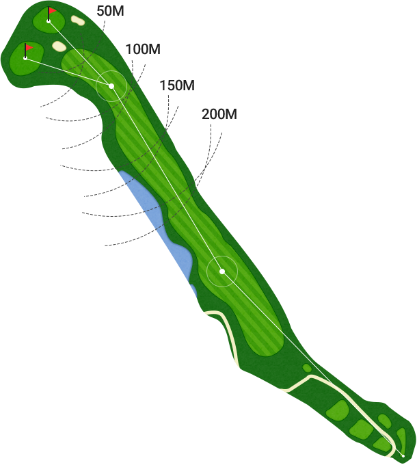 시원스럽게 내려치는 PAR5 홀로 도전적인 홀이다. IP지점 좌측 해저드와 우측의 O.B라인이 있어 쉽지 않은 티샷이 필요하다. 티샷이 잘 왔다면 세컨은 좌,우 그린을 확인 후 유리한 곳으로 공략하면 된다. 그린은 포대그린이며 오르막을 잘 계산하여 공략하는 것이 좋다.