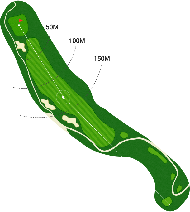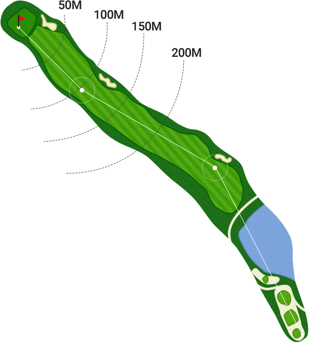 그린까지의 고도차가 심하며 전체 전장의 전방 130M 까지 펼쳐진 워터해저드가 도사리고 있어 안정된 티샷이 요구되는 홀이다.