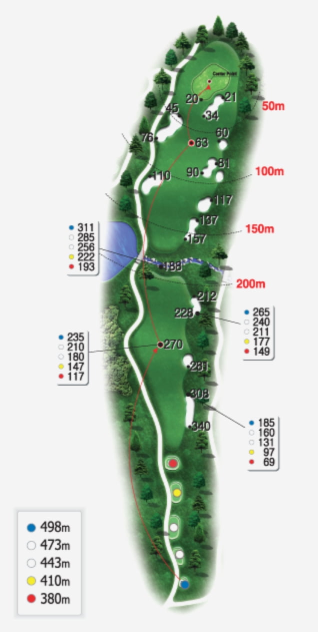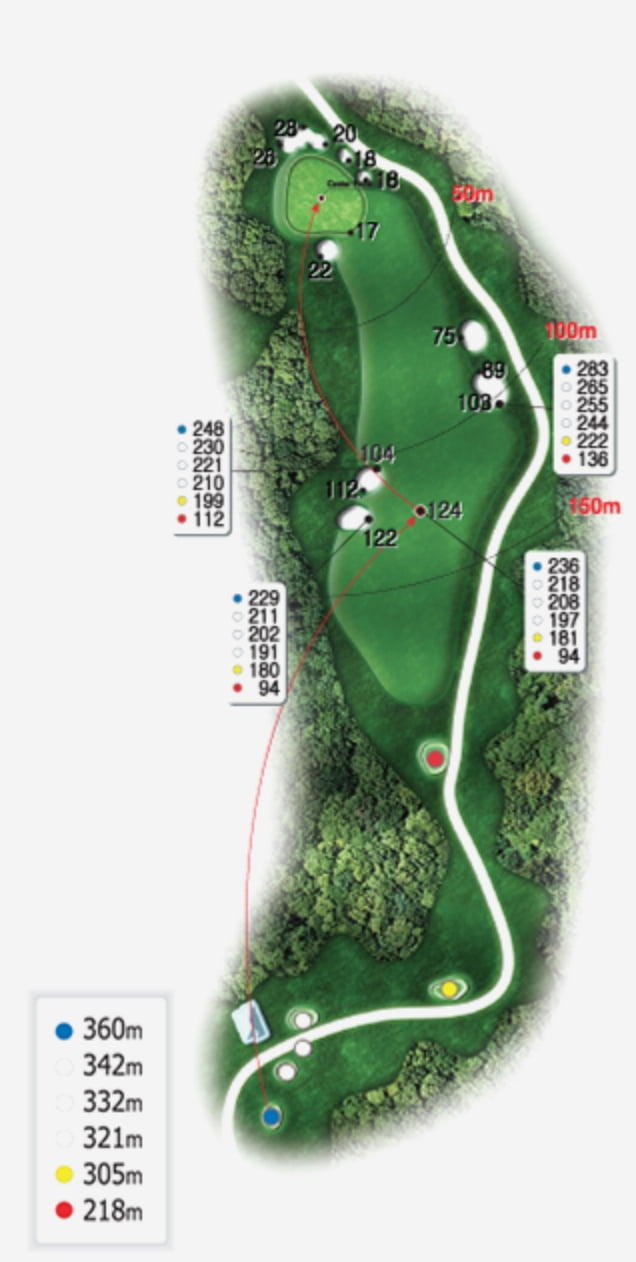 그린 중앙보다 우측으로 공략하는 것이 안전하나 내리막으로 반클립 정도 적게 보는 것이 정확한 거리 값이다.