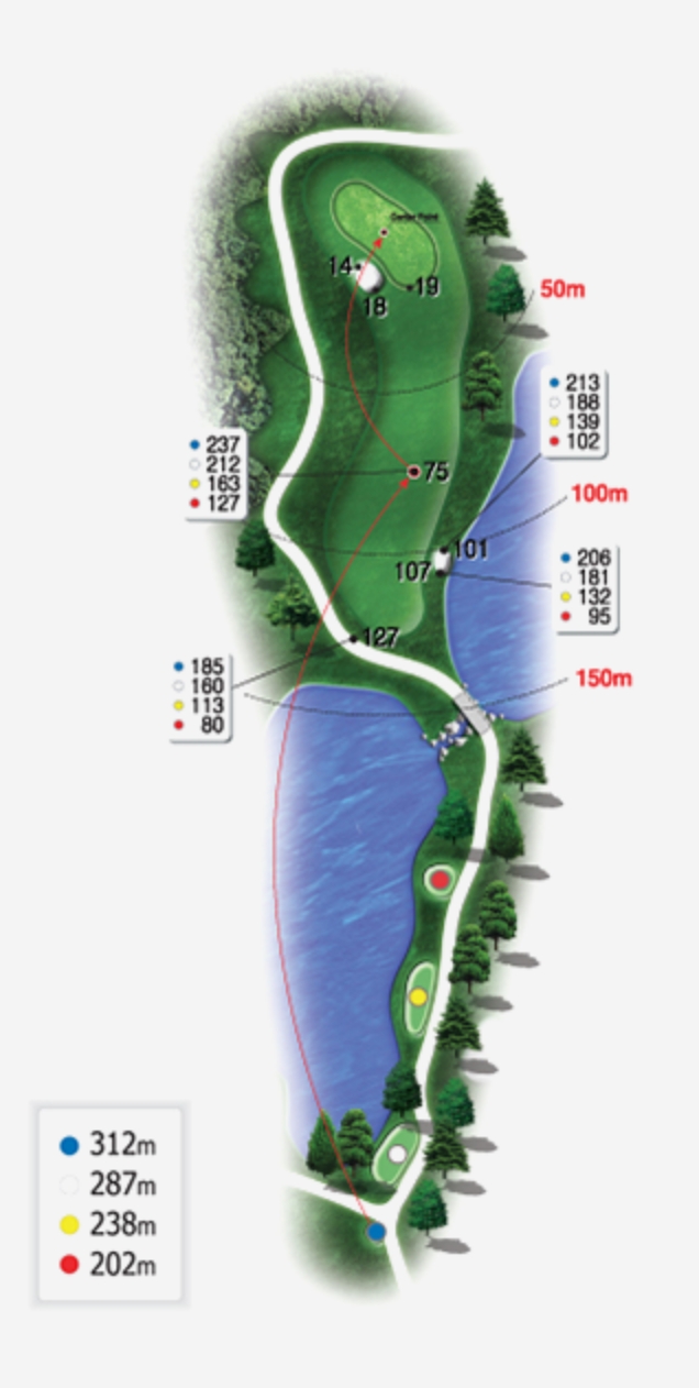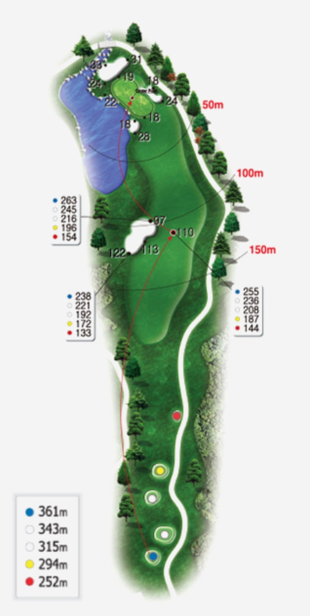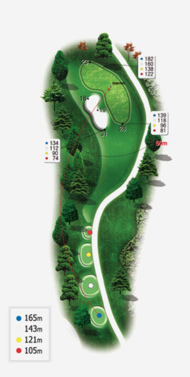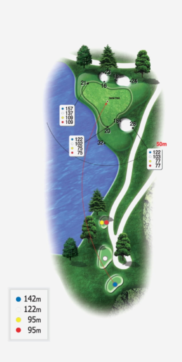 보내야 하는지 망설임을 갖게 하는 파3홀이다. 좌우 이단그린으로 핀 방향으로 보내지 못하면 3퍼팅을 각오 해야 한다.