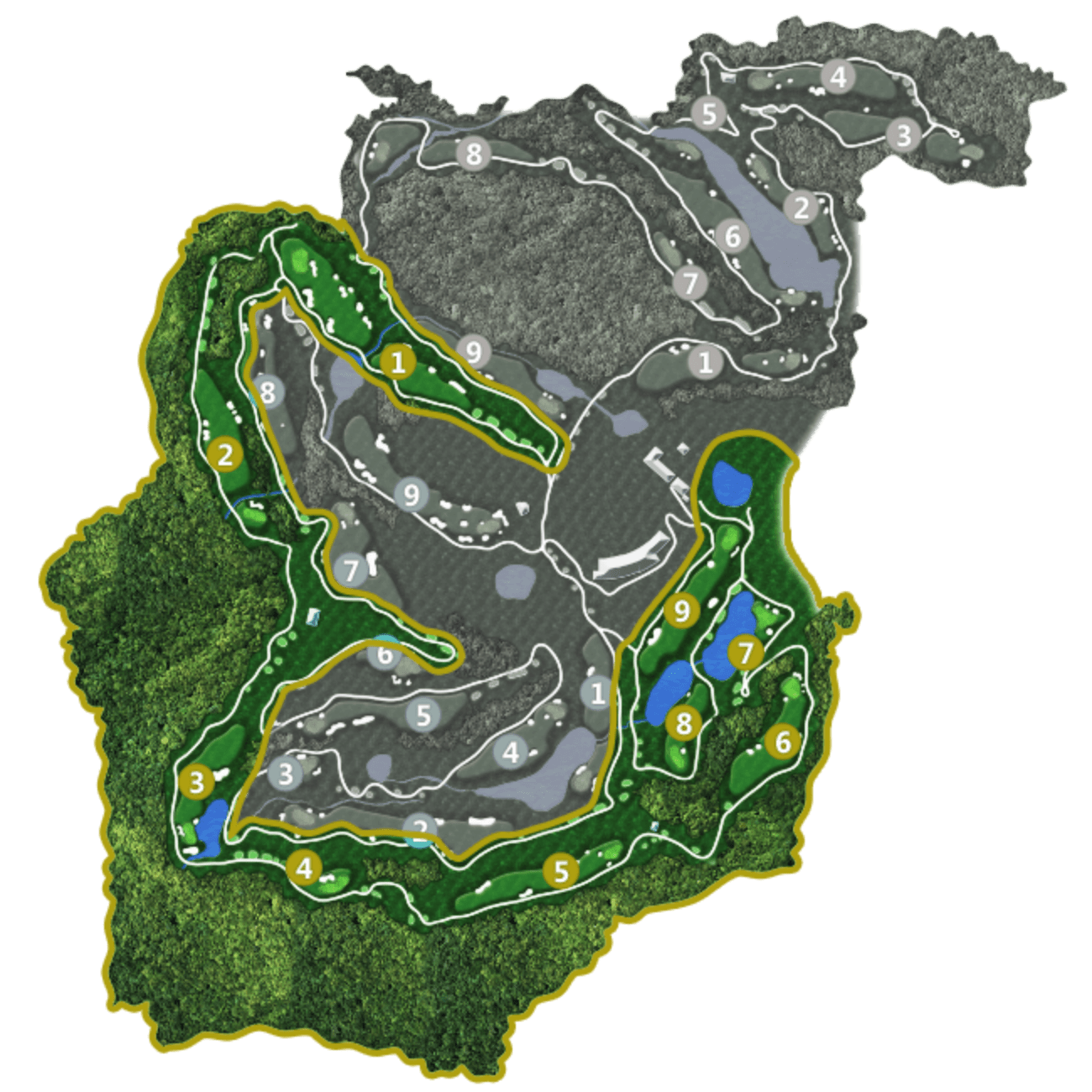 약간 좌 도그랙 매우 긴 거리 파4 홀로 그린 앞에 실개천과 대각선으로 그린이 배치되어 장타자가 아니면 투온 그린하기 쉽지 않다.