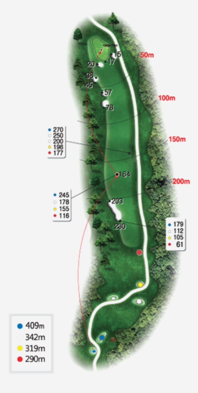 티샷은 좌측 언덕 마운드 방향이 이상적이나 앞의 계곡부터 넘겨야 한다.