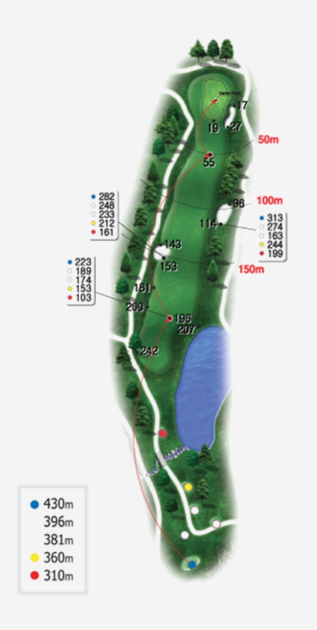 티샷의 방향성이 매우 중요하며 또한 폭이 좁고 앞뒤가 매우 긴 그린으로 핀 위치에 따라 2클럽 까지 차이가 난다.